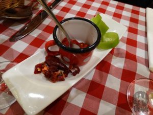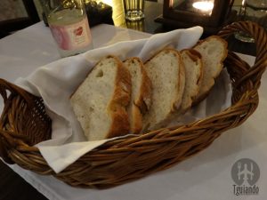 Antes das entradas, trouxeram pães, um tipo bolo salgado e pimentas.