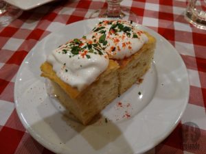 De entrada pedimos fried dough (grated cheese and garlic sour cream topping), 1050 Ft, goulash soup with mini noodles, 1200 Ft. Uma massinha frita coberta com queijo ralado e creme de leite com alho e a tradicional sopa.