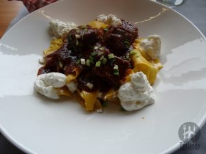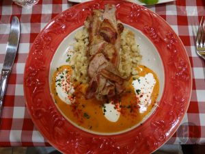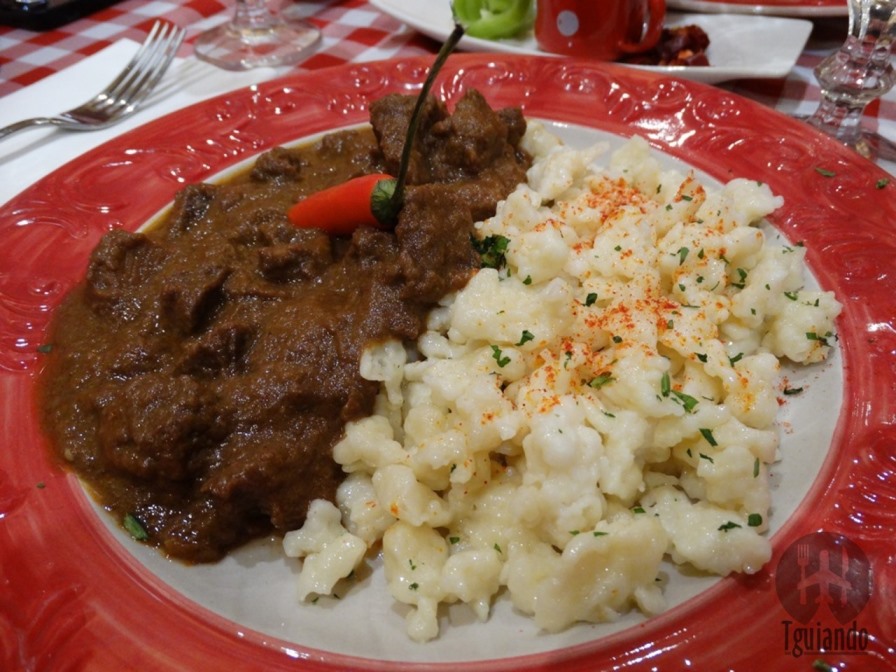 Hora dos pratos principais: loin of pork withpaprika sauce and bacon-sour, cabbage dumplings, 2750 Ft, beef stew with dumplings, 2500 Ft. Os pratos estavam lindos!! Lombo de porco com molho de páprica e bolinhos de repolho com bacon e ensopado de carne com uma massinha que lembra um nhoque (lembra…) Estavam deliciosos, até hoje lembramos desse restaurante e, para nós, um dos melhores!!