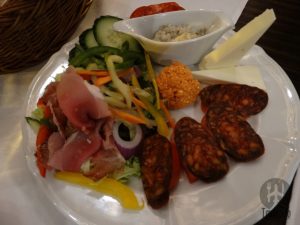 Pedimos de entrada hideg parasztlakoma 2 fõ részére vagy 1 fõre, 1950 Ft, e os pratos principais foram: roston sült csirkemell sajtal és sonkával töltve sütõtökös pürével, 3150 Ft, marha hátszín steak sült hagymával és burgonyával, 5450 Ft.