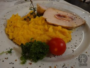 Nos trouxeram pães com a entrada que pedimos: tábua de frios. Os pratos principais estavam bem bonitos e gostosos: peito de frango grelhado recheado com queijo e presunto com purê de abóbora, bife de filé mignon com cebolas fritas e batatas.