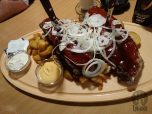 Pedimos spare ribs (mit bratkartoffein & saucen – L), € 13,90. Uma porção de costelinha de porco e batata frita.