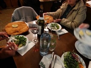A primeira refeição austríaca foi no bairro de Grinzing, belo bairro nos arredores de Viena onde se cultivavam vinhas que deram lugar a muitos pequenos restaurantes. O translado até estava incluso no pacote, bem como o jantar no RST Alter Bach-Hengl para passageiros que adquiriram meia pensão, que não foi o nosso caso.