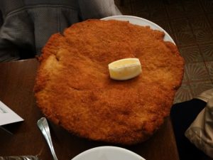 O prato não poderia ser outro além do Figlmüller-Schnitzel (vom schwein), € 14,90. É um filé de carne de porco bem fininha empanada e frita, o detalhe é que é muito grande, maior que o próprio prato.