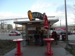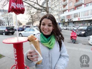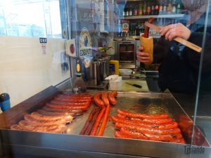 Entre um ponto turístico e outro, vale a pena parar e comer um cachorro-quente. Parei nessa “barraquinha” e pedi um, € 4. O pão é quase que uma baquete e a salsicha, que é o mais diferente daqui.