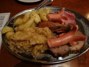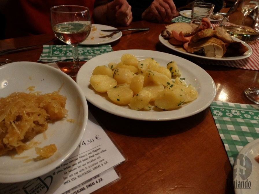 Pedimos plateau caliente mixto de la casa (geräuchertes fleisch, schweinebraten, brathähnchen, gegrillter sasicha, kartoffeln, sauerkraut und brot), € 14,50. Joelho de porco, frango, salsicha, batata e chucrute em porções bem servidas e tudo muito gostoso!!
