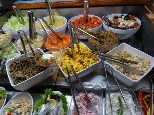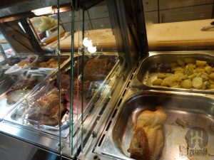 Logo na entrada um buffet com diversos pratos. Melhor do que cardápio com foto. Mas não era buffet de self-service.