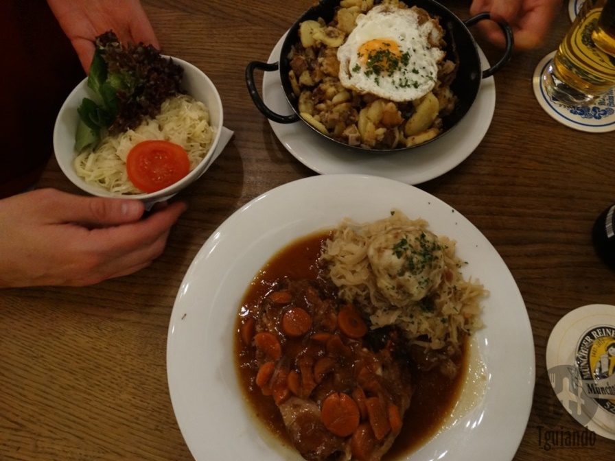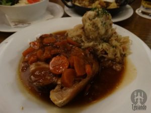 Pedimos: bauern gröstl (especialidade tirolesa com batata, ovo frito e salada de repolho), € 9,2, asado de cerdo (com molho de cebola, cenoura e cerveja com chucrute e almôndega de pão), € 10,9.