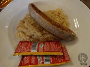 Para comer: pretzel, € 1,2, portion of butter, € 0,9, original HB sausage platter (with pork sausages, viennese and pfälzer sausage on a bed of sauerkraut), € 12, HB fried sausage (large, grilled pork sausage with sauerkraut), € 7,9, a crisp roast of Bavarian suckling pig (servd with homemade natural gravy and a potato dumpling), € 14,5.