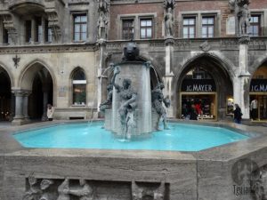 Por muito tempo, a Marienplatz foi a praça de mercado de Munique, onde mercadores ofereciam ali os seus produtos, entre eles frutas, verduras, sal, milho, ovos, farinha, vinho e peixe. Por isto que a fonte na esquina tem o nome de Fischbrunnen (Fonte do Peixe).