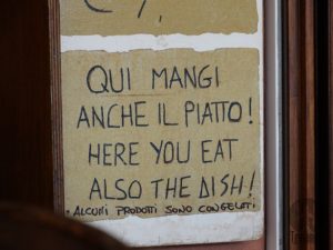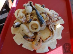 Pedimos spaghetti “scogliera” with fish and tomato, € 11,50, fritto misto (fried fish expressly with polenta ina bread-dish), € 13, e risotto al pesce with fish, € 16,50. Não é totalmente ruim, mas não nos agradou muito, os peixes são muito misturados.