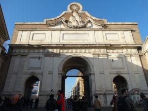 A Piazza ainda possui uma porta, que fica ao lado da Igreja Santa Maria Popolo. Antes, a porta chamava-se Flaminia e era a principal entrada dos visitantes que chegavam pelo norte da cidade. Com a construção da Igreja Santa Maria del Popolo, a porta passou a se chamar Porta della Popolo.