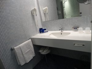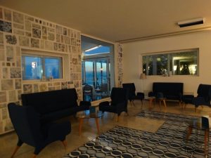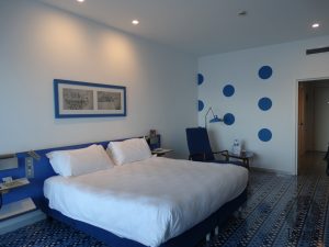 Todo o hotel tem tonalidade de azul e chama bastante atenção, os pisos e azulejos, cadeiras e sofás, quadros e outros detalhes.