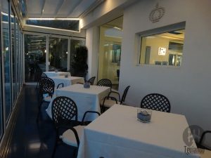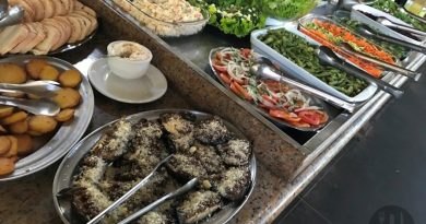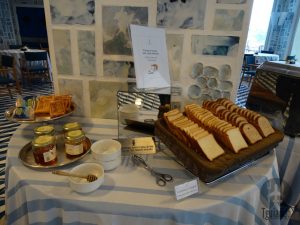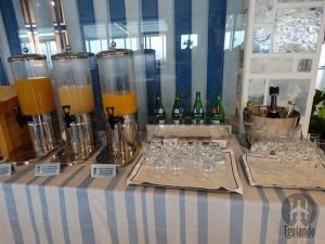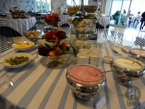 A área do café é grande e ainda tem as mesas ao lado da grande vidraça, com vista para o mar. O café da manhã tem das mais diversas opções de pães, doces, frios, iogurtes e sucos, até champanhe.