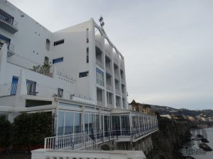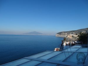 O quarto é bem espaçoso, com varanda e vista para o mar e até o vulcão Vesúvio. O banheiro também é grande, mas com chuveiro na banheira.