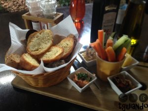 De entrada pedimos couvert, R$ 13 por pessoa, que vem torradinhas, cenoura, pepino e molhos.