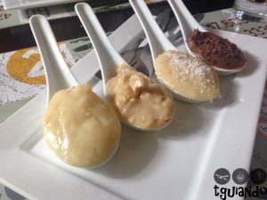 Pedimos quarteto na colher (brigadeiros nos sabores de chocolate amargo, lavanda, castanha de caju e coco queimado), R$ 20, e cocada alagoana (cocada de forno acompanhada com uma bola de sorvete de tapioca, abacaxi e mel de flor de laranjeira), R$ 21.