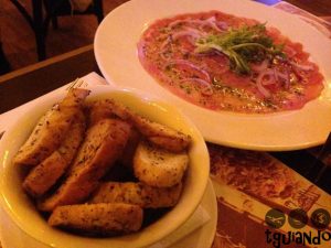 Pedimos cuisses de grenouilles à “Zilu Camargo” (deliciosas e crocantes coxinhas de rã puxadas ao molho provençal), mas nos informaram que não tinha. Então pedimos carpaccio de Thon à “la promenade des anglais” (carpaccio de atum premium 100g ao vinagretede cebolas roxas e raspas de limão siciliano), R$ 43. Bem apresentado, porém, estava congelado. Informamos ao garçom e o mesmo disse que daria desconto no final da conta.