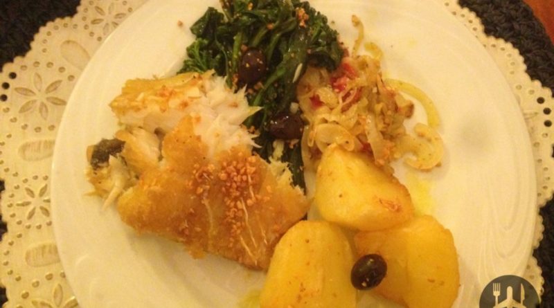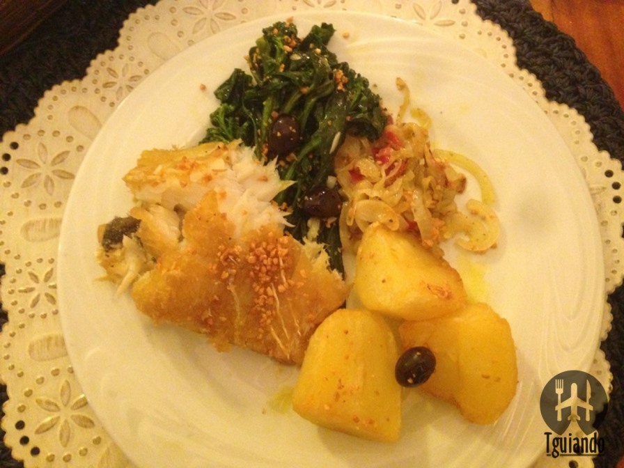 Tínhamos escolhido o bacalhau na brasa com azeite e migas (posta alta na brasa e adormecida no puro azeite português, pimentão e ovos, com batatas ao murro e migas feita de broa, azeite, alho e brócolis, tudo regado com alho fatiado no azeite), mas estava em falta devido ao tempo de preparo. Sendo assim, nos recomendaram o crocante no azeite (posta generosa e crocante, grelhada no azeite português, com batatas coradas, brócolis, pimentão, cebola, azeitonas portuguesas, muito alho torrado e perfumado). Ficamos na dúvida sobre o tamanho a ser pedido, nos informaram que a baronesa para casal, R$ 149, era o suficiente, seguimos o recomendado. Adoramos, estava muito gostoso, bem crocante e a porção realmente é bem caprichada, comemos bem e ainda levamos parte.