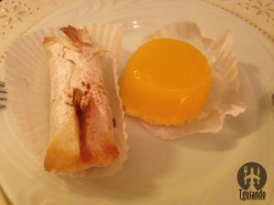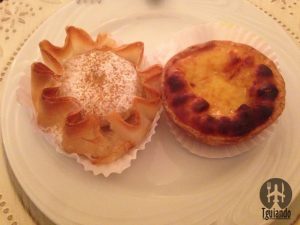 Ganhamos duas sobremesas, mas com a dificuldade em escolher, acabamos pedindo mais duas: pastel de Santa Clara, pastel de Belém, R$ 6,90, pastel de Tentúgal e quindim, R$ 6,90. Somos suspeitos em falar sobre doces portugueses, mas estavam bons.
