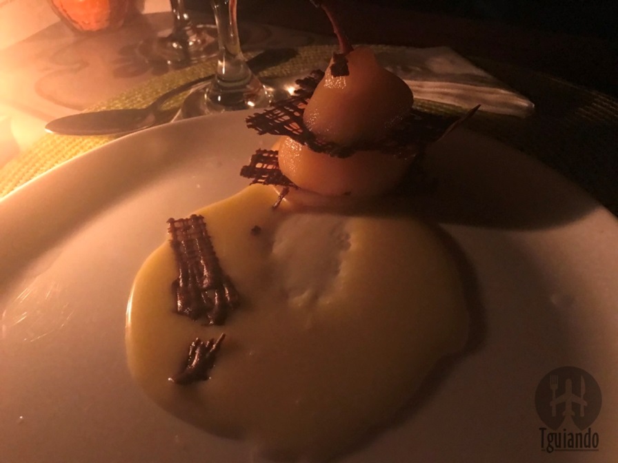 Por fim, a sobremesa: belle Hélène. Talvez a mais fácil de identificar os sabores, pera, chocolate e um creme.