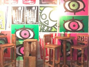 Luz fraca, grafite em algumas paredes e outras são rústicas; algumas mesas altas e outras baixas, banquetas de madeira e uma área com sofás com vista para a rua.