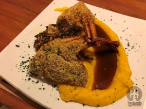Os pratos principais escolhidos foram: bife Wellington (filé mignon envolto em cogumelo, presunto cru e massa folhada com risoto de parmesão), R$ 68, e carré de vitelo (coberto com crosta de panko com hortelã, purê de mandioquinha, tomates e cogumelos salteados), R$ 72.