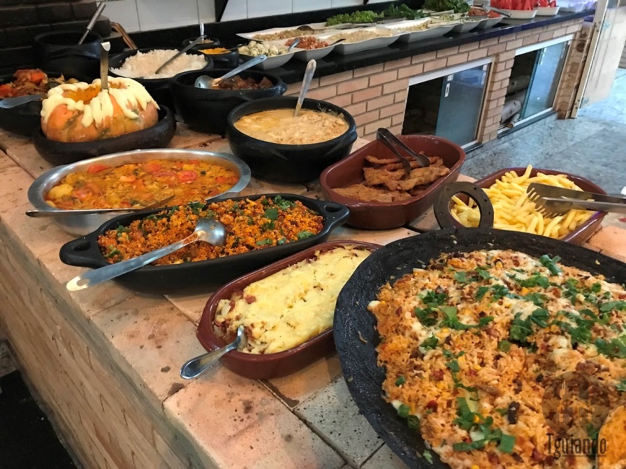 O buffet, R$ 42,90, oferece diversidade de saladas, pratos quentes no fogão a lenha, desde o arroz e feijão, macarrão, até camarão na moranga. E ao lado, claro, a costela, além de pernil e outras carnes.