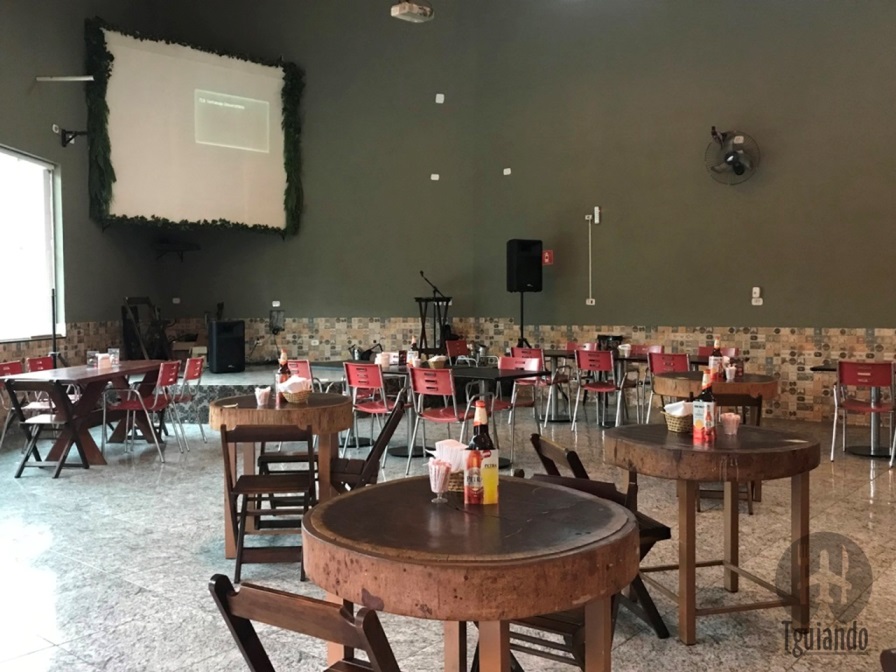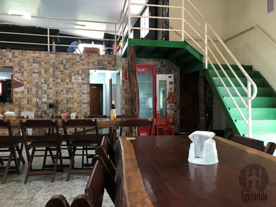 Ao entrar, um salão grande, com várias mesas espaçadas e ao fundo o bar e a cozinha.