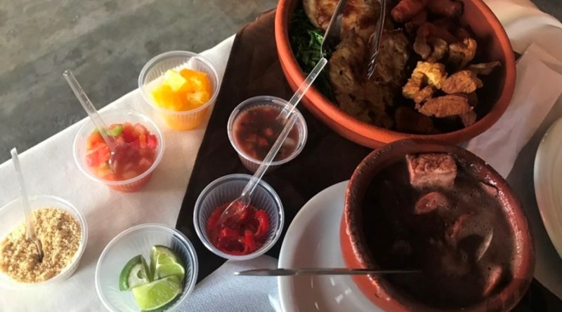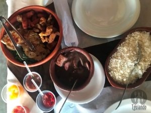 Apesar do calor, pedimos a feijoada para 2 pessoas (arroz, bisteca, torresmo, couve, linguiça, farofa, molho e laranja), R$ 108. A feijoada é servida separada, ou seja, arroz, feijoada com calabresa e carne seca, numa terceira travessa a bisteca, linguiça, torresmo e couve.