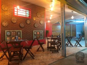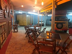 Tem mesinhas próximas ao caixas, na área coberta, e outras do lado de fora.