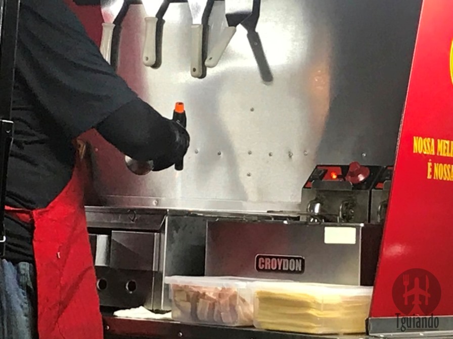 O preparo é feito na chapa com auxílio de maçarico dentro da kombi que fica no meio do local.