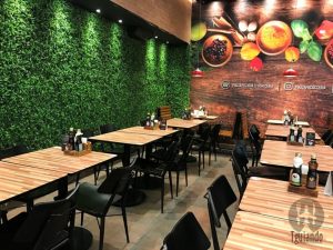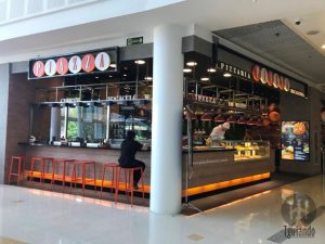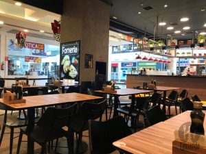 Várias mesas, deixando o ambiente até um pouco apertado, com vista para o corredor do shopping.