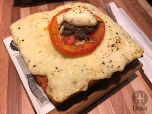 Optamos pelo pedaço de focaccia, R$ 12, escolhendo caprese e ravena. Os pedaços são servidos em pequenas tábuas de madeira, pouco maior que o generoso pedaço de focaccia. Para comer com talher fica um pouco difícil.