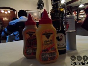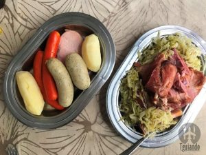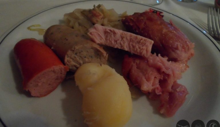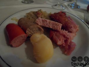 O prato principal não poderia ser diferente de schlachteplatte komplett gekocht oder gegrillt (bisteca, joelho pururuca, chucrute, salsicha branca, salsicha com alho e batata cozida).