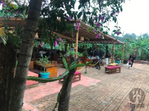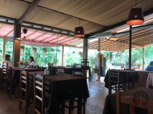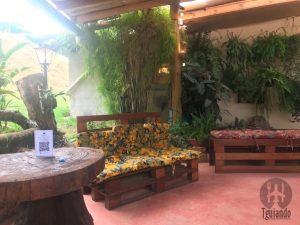 Até pensamos em voltar outro dia, mas como já era tarde, corria o risco de acontecer o mesmo em qualquer outro restaurante. Sendo assim, decidimos esperar. A área de espera fica do lado de fora, no alto, como se fosse um palco. Dali pudemos observar os detalhe do restaurante, ele é simples, mas bem bonito e aconchegante, com mesas na área externa com vista para muito verde e, na área interna, onde ficamos, tem o bar.