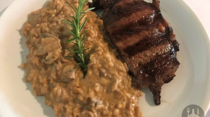 Assim, nossas opções diminuíram muito, porque a maioria dos pratos oferecidos tem camarão. Por fim, nós dois acabamos escolhendo chorizo com risoto, R$ 54, só que um com risoto de limão caipira e outro com risoto de cogumelos.