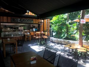 Logo na entrada, o bar fica à esquerda com as belas e chamativas torneiras brancas, com detalhes em azul e dourado, além da torneira com infusão de laranjas, colorindo o lugar. Algumas mesas ali e outras à esquerda, ao ar livre, em um pequeno jardim, além de um charmoso balanço. Ao fundo, a cozinha.