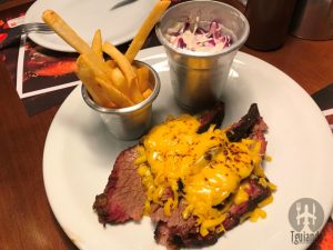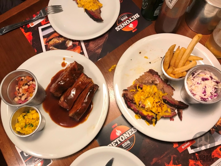 Pedimos croc brisket (tiras de peito bovino Angus defumadas e empanadas em farinha Panko, acompanha sour cream), R$ 24, brisket (200g da chamada picanha texana, com mais de 10h de preparo até virar pura suculência), R$ 42, com queijo maçaricado, R$ 3, e costelinha (250g de carne soltando do osso e lambuzadas com molho barbecue da casa), R$ 40. Ambos com 2 acompanhamentos, que escolhemos: coleslaw (salada refrescante do sul dos EUA com repolho roxo, repolho branco, maçã e aioli), fries (fritas crocantes), mac’n cheese (macarrão com molho de queijos) e caviar texano (salada de feijão fradinho refrescanet).