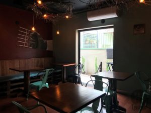 Um restaurante pequeno, mas bem aconchegante, com decoração legal, destaque para as luminárias.