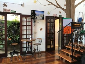 Do lado interno ficam algumas mesinhas, com portas e janelas grandes, iluminando bastante o lugar. Destaque para o papel de parede de árvore bem no canto, ao lado da escada.