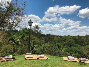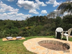 O lugar estava vazio, mas muito aconchegante, com tambores como mesas, guarda-sol, além de almofadas espalhadas na grama com vista para a mata. Fomos super bem atendidos!!
