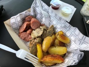 Para comer, tinham algumas porções com salsichas, e joelho de porco. Pedimos com salsichas, R$ 30, como queríamos só um petisco, ok, mas achamos pequena pelo valor.