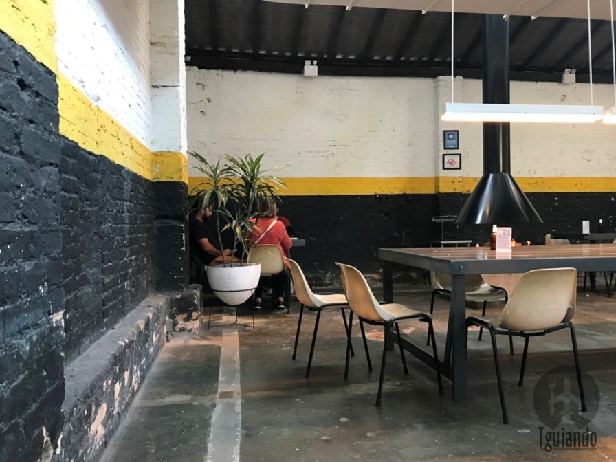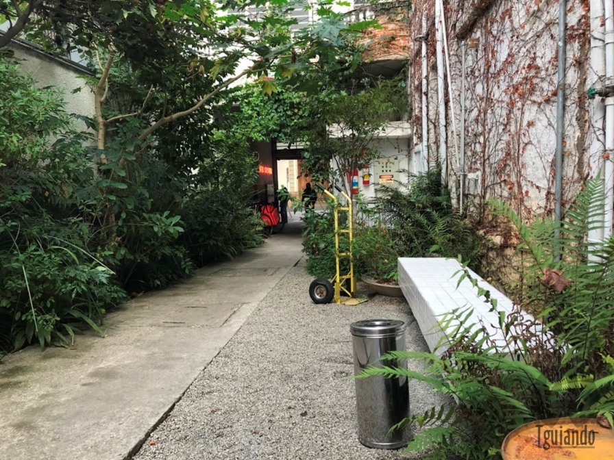 Um corredor com algumas plantas e flores, além de bancos de concreto, faz dali o lugar de espera de mesa, onde ficamos por um tempo, mas bem rápido.
