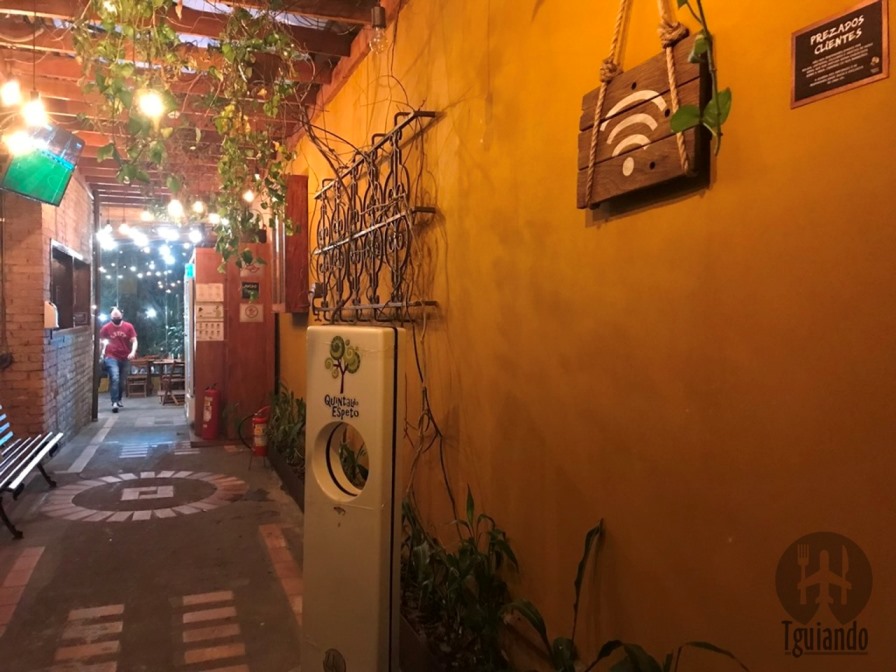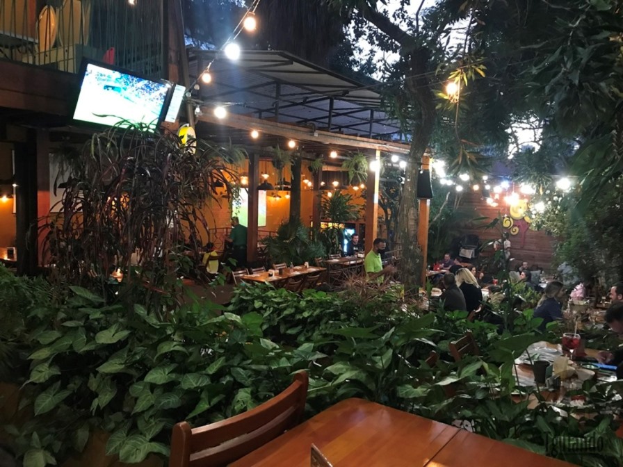 Um corredor passando pela cozinha e um bar leva ao outro ambiente fechado com vidro e TV, descendo umas escadas, algumas mesinhas mais reservadas no meio de muito verde, mas com visão do palco.