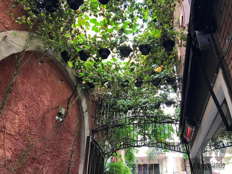 Um charme desde a calçada, corredor com muito verde e mesinhas.