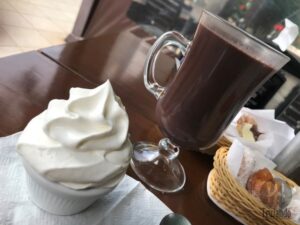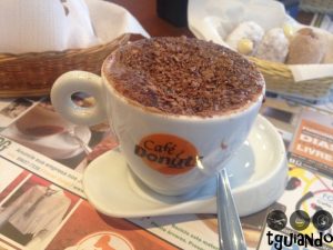 Pedimos chocolate cremoso europeu (acompanha chantilly), R$ 13,90, e cappuccino italianíssimo (chocolate em raspas, espresso, leite vaporizado e canela em pó), R$ 11,90.