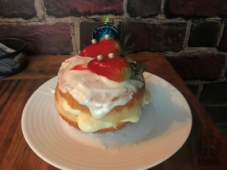 Pedimos tradicional colorido (rosquinha com cobertura de chocolate rosa e granulado), R$ 10, bavarian (donuts recheado com creme suíço de baunilha e coberto com açúcar de confeiteiro), R$ 15, e bavarian morango (donuts recheado com creme suíço de baunilha e coberto com chocolate branco e morangos), R$ 15. São gostosos!!