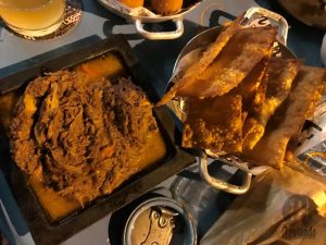 Pedimos porções para comer, charcutaria (jamón serrano e a tradicional linguiça artesanal do Gijo, acompanha queijo Campo Redondo e suíço gruyére, servida com pão e manteiga temperada), R$ 45, e ceviche (peixe branco no sumo de frutas cítricas, com pimenta dedo de moça, coentro, cebola roxa, tomate e crispy de couve), R$ 20, mas o garçom informou que a cozinha já tinha encerrado, mesmo assim anotou os pedidos e verificaria o que poderia fazer.
