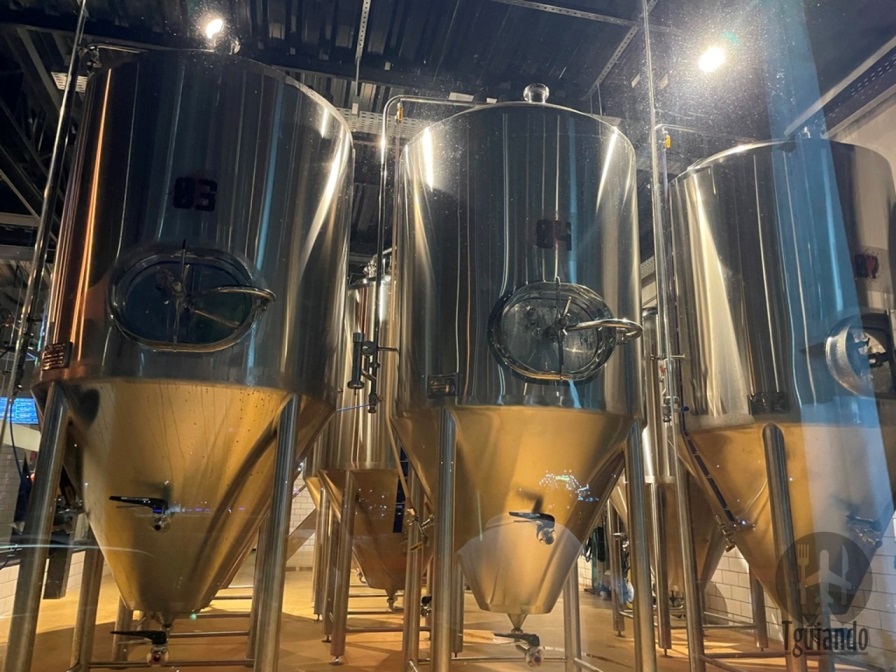 Em frente ao lago, com mesinhas no deck e outras no lado interno, ao lado dos fermentadores e parede com várias torneiras de chopp no sistema on tap.